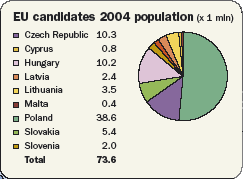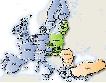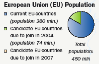 In 2004, 10 countries from the former Eastern European region will become members of the EU. The first change in this process is that this area will no longer be referred to as Eastern Europe, but instead as Central Europe. The addition of these new members of the EU will mean that 73.6 million residents will be added to the current 380 million at once, an increase of 20%! However, the Euro will not be introduced as the official currency in these countries until 2008 or later.